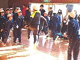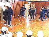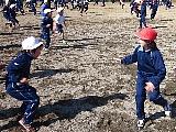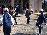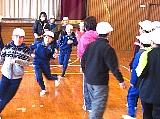 業間に児童集会で、「引っ越し鬼」というゲームをしました。児童会運営委員の企画で、中央の鬼(赤い帽子)にタッチされないように反対側に逃げるゲームです。