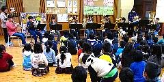 業間に、6年生による音楽発表と金管バンド部の演奏がふれあい広場で行われました。今年度最後の音楽集会でした。