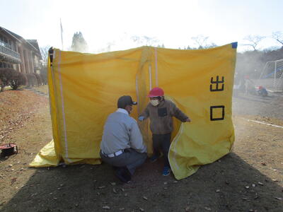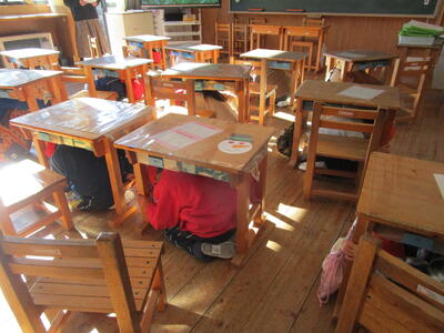 ゆれがおさまり、出火した想定で校庭に避難します。