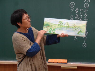 「すいか」「はんぶんこ」「うえきばちです」の本を↑1・2年生は読んでいただきました。