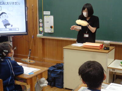 本日 4校時に栄養教諭より食育に関する講話を1・2年生保護者対象に実施しました。これは家庭教育学級の活動の一環でもあります。