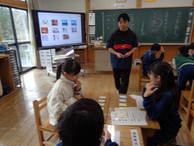 来校いただいた学校運営協議会の委員の皆様や地域連携協議会の皆様とあいさつを交わし、「こっちむいてほい」をしました。(指示された方向に縦割り班メンバーの3名以上がそちらの方向に向けば、メッセージカードをゲットします。)
