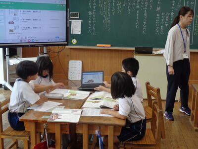 1年生はICT機器を使用しながら 仲良くイラストを描いていました。(このあとクイズかな?)