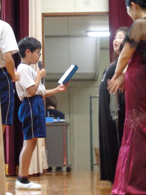 3年生 6年生の代表児童から1学期の思い出や反省、夏休みに楽しみにしていることなどについて作文発表をしました。上手でした。