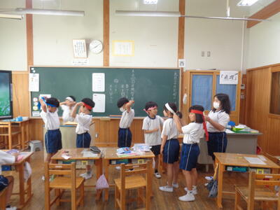 ラジオ体操 前に立つ6年生は反対の動きですが上手ですね・・・さすがです
