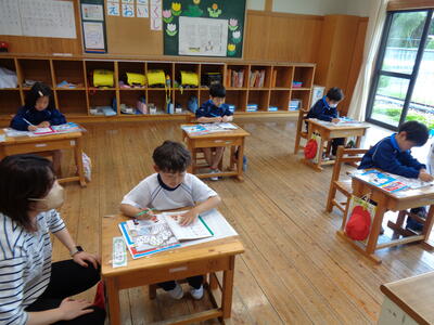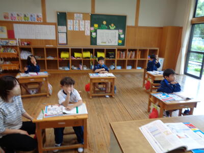 1年生は 市貝小給食室の見学にでかけました。(5人で貸し切りバスです。)その後、5時間目の様子です。↓