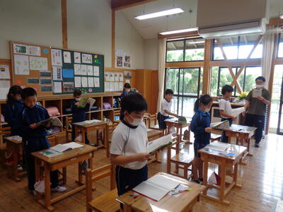 4年生、しっかりした姿勢で(起立して)音読をしています。