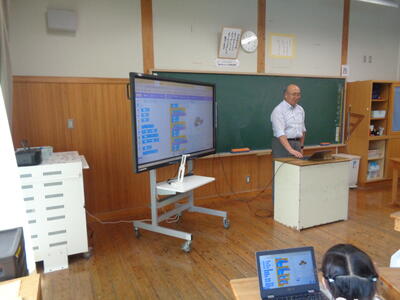 担任の先生とTT(チームティーチング)で 「さしばのさっちゃん」を自由自在に動かせるようプログラミングする方法を学びました。