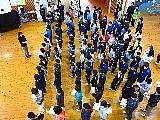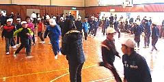 業間に児童集会で、「引っ越し鬼」というゲームをしました。児童会運営委員の企画で、中央の鬼(赤い帽子)にタッチされないように反対側に逃げるゲームです。