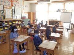 1月8日(金)、約2週間の冬休みが終わり、今日から3学期がはじまりました。子供たちは、書き初めやドリルなど、冬休みの宿題をたくさん持って登校してきました。子供たちの笑顔が学校に戻ってくると、すごくワクワクしてうれしい気持ちになります。3学期の始業式を放送で行った後、養護教諭から感染症を予防する合い言葉「うまくきたえて」の話をしました。