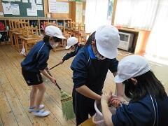 12月3日(木)、清掃の時間の様子です。本校では、活動班(1年生から6年生までの縦割り班)で清掃を行っています。学年にあった仕事を分担して清掃を行っています。子どもたちは、自分の役割を果たそうと一生懸命に取り組んでいます。また、上学年の児童が下学年の児童にいろいろなことを教えている姿もあちこちで見られます。清掃の時間にも、勤労、思いやり、協調性など多くのことを学ぶことができます。このように考えると学校での生活はすべてが学びの場になります。ひとつひとつのことを大切にして、大きな成長ができるよう支援していきたいと思います。