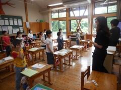 9月11日(金)、1・2年生が首を長くして楽しみに待っていた外国語の活動の日です。歌を歌ったり、野菜の名前を言ったりしました。座って歌を歌っていたのですが、自然にリズムに乗り、立ち上がって踊り出してしまいました。笑いながら自然に踊りだす子供たちの姿を見ていると、自ら学ぶ姿の原点を見たような気がします。「学ぶべきことを 自ら楽しみながら 教えを得て そして育つ」といった感じですね。
