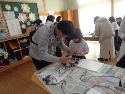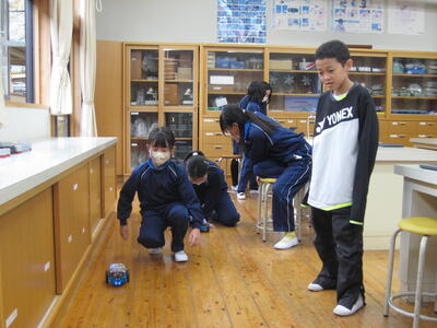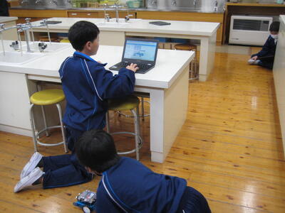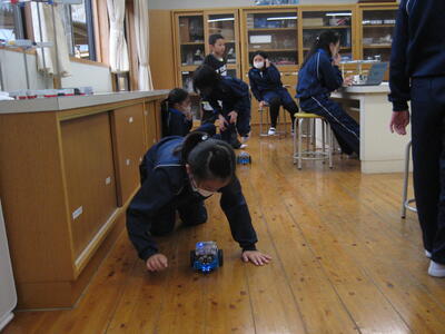 「病院内を自動で動ける車いすをプログラムしよう」という学習を行いました。情報教育指導員の先生にプログラミングの仕方を教わりながら、ロボットを動かしました。思った通りに動くようにと調整しながら活動していました。