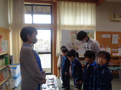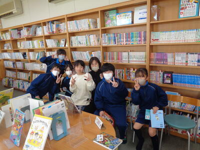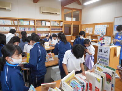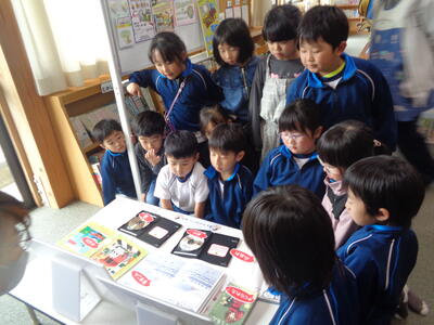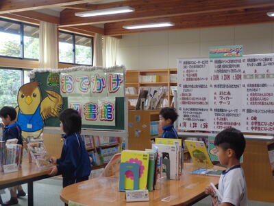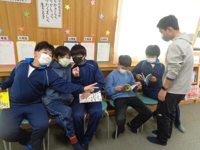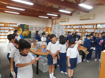 今日は、町の図書館の方が、学校へ「おでかけ図書館」に来てくださいました。