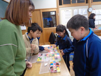英語で「黄色のダイヤモンドの形を2つ下さい。」など やりとりをしています。さりげなく「サンキュー。」と言えるコミュニケーションが良いですね。