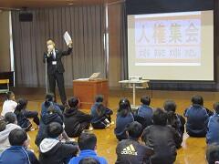 12月7日(月)、1・2・3年生に続き4・5・6年生が業間の時間に市貝町教育委員会の先生を講師にお迎えして人権集会を行いました。当事者意識というキーワードをもとに人権についてわかりやすくお話していただきました。今後も、ひとりひとりの人権意識の高揚が図れるようにあらゆる機会をとらえて指導していきたいと思います。