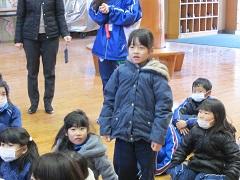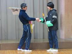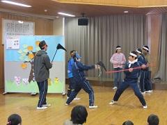 最初は桃太郎が男の子バージョンで、犬・サル・キジにあげる物は「きびだんご」でしたが、後の方は桃太郎が女の子で、おむすびをあげていました。大きくきれいな発音で楽しく演技していました。鬼とのバトルのシーンでは、観客の下級生たちは大喜びでした。
