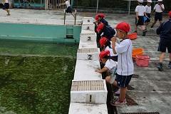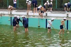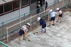 4~6年生はプールサイドと水を抜いたプール床や壁をブラシできれいにしてくれました。気持ちよく水泳の授業ができそうです。道徳教育との関連は「勤労、公共の精神」を意識しました。
