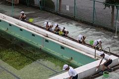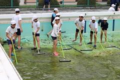 1~3年生はプール周りの側溝やプールサイド、更衣室の清掃を頑張ってくれました。落ち葉や土がたまっていましたがきれいになりました。