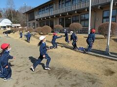 2月4日(木)、業間の時間は共遊でした。学級ごとに遊びを決めて仲良く遊びました。雲ひとつない晴天の中、子供たちが校庭いっぱいに広がり笑顔で走りまわる姿に優るものはありません。今までと違うのは、マスクをつけていることです。図工で学習した版画が廊下に飾ってありますが、マスクを着けている人物もあちこちで見られました。子供たちの素直な表現だと思います。こんなところまで影響しているのだなと思いました。
