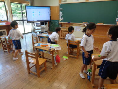 休み時間は1年生は室内で折り紙あそび・・・紙飛行機や手裏剣で楽しんでいました。
