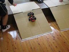 7月30日(木)、4年生が理科の授業で電池で走る自動車を走らせていました。どの自動車も平らなところでは速く進むことができましたが、ダンボールの坂を登らせようとすると、途中までは登っても最後までたどり着かずにさがってきてしまいます。そこで、ダンボールの坂を登るために、友達の電池を借りて電池の数を増やしてみたり、くるまの不必要なパーツをはずしたりするなど、多くの工夫が見られました。最終的には、ダンボールの坂を登りきることができ、満足した様子の顔がみられました。