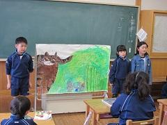 2年生の児童から招待され、手作り紙芝居「ニャーゴ」の発表を見に行きました。
