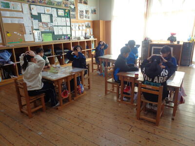 百人一首でお手付きをしないように 手を頭にのせてスタンバイしている4年生です。
