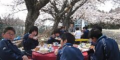 桜満開の下で、5・6年生がお花見給食を楽しみました。時折花びらが舞う中での食事は、ひと味違うようです。