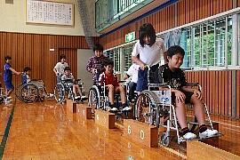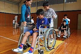 町の社会福祉協議会と連携し、車いすで生活されている大塚くんぺいさんにご指導いただきました。ハンディキャップのある方の現状や思い、困っていることなどの話をお聞きし、その後、車いす体験をしました。最初は緊張していた子どもたちが、どんどん大塚さんに近づき、どんどん質問している姿が印象的でした。すばらしい体験ができました。