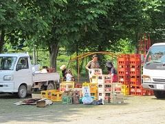 切り出した竹はふれあい広場に飾られ、さわやかな初夏の季節感をかもしだしています。これから飾り付けが行われるようです。