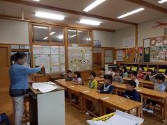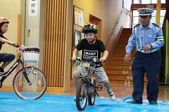 あいにくの雨で、校庭で実施することができず、ふれ合い広場で行いました。子どもたちの指導に、続谷駐在所の栁 和宏さん、交通指導員の大滝  挌さん、大塚  功さんが来てくださいました。子どもたちは、ハンドル、ペダルなどの自転車のパーツの名前や、乗り出す前に前後や後ろを確認すること、自転車は左を走ることなどがわかりました。また、命に直結する乗り物であることも理解できました。