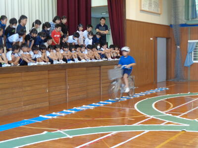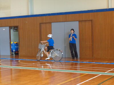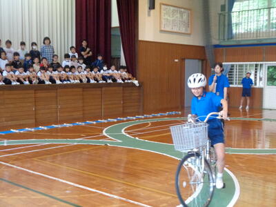 ステージや観覧席(2階部分)から在校生が見守る中で、緊張した様子でしたが、上達した自転車技能を披露してくれました。