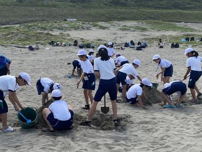 昨日の砂浜活動の様子、作品は、市貝小のホームページを見てください。(赤羽小のホームページにも、写真が掲載されていますので、ご参考にして下さい。)砂浜で作った作品は、テーマがカメ、船、富士山、、など、グループで相談して作りました。他校の5年生とシャッフルした班で作成しました。