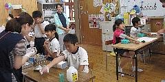 埋蔵文化センターの職員3名の方を講師に招いて、6年生社会科の授業をしていただきました。身近な土器などを説明していただいた後、曲玉づくりを体験できました。