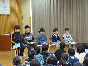 学級委員は、2年小堀泰知さん、3年黒﨑優太さん、4年小森匠真さん、5年関谷友宏さん、6年佐藤弘大さんです。学級委員を中心に、みんなで力を合わせ、素晴らしい学級にしていってほしいと思います。