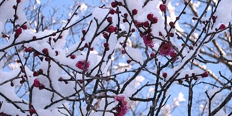 がんばり坂(正門前)の紅梅が先週開花し、昨日の雪に負けじと花を開いていました。
