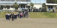 本日の業間に避難訓練を行いました。まず地震が発生したとの想定で、机の下に避難しました。その後、家庭科室より出火の想定で校庭に避難しました。小雨の中でしたが、子どもたちは避難指示から3分30秒で静かに整然と避難場所に整列できました。