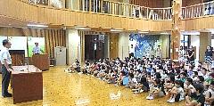 例年より3日早い終業式が行われました。校長式辞の後、各学年代表児童による1学期の反省や夏休みに頑張ることなどの発表がありました。また、学習指導や生活指導の後、校歌を元気に歌って終了しました。