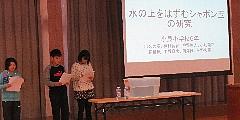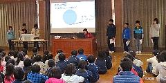 1月18日(月)に行われた芳賀地区理科研究発表会で本校の6年生8名が発表しました。本日の業間に、その発表「水の上をはずむシャボン玉の研究」を全校児童にも行ってもらいました。