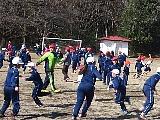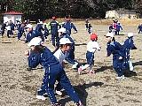 業間に児童集会で、「引っ越し鬼」というゲームをしました。児童会運営委員の企画で、中央の鬼(赤い帽子)にタッチされないように反対側に逃げるゲームです。