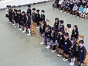 全校児童を代表し、6年生の佐藤弘大さんが誓いの言葉を述べ、6年の平野莉央さんが、JRCについての説明をしてくれました。2年生から6年生は「誓い」に署名しクラス代表が、教頭先生に手渡しました。1年生にはJRCの会員バッチが送られました。