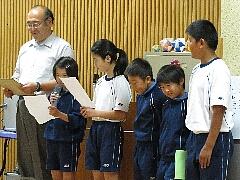町陸上記録会の入賞者・郡陸上記録会の入賞者とバレーボール芳賀塩谷支部予選会優勝の表彰でした。多くの入賞者にしっかりと賞状を渡しました。伝達後、郡陸で補助として参加してくれた6年生がしっかりとした態度で動いてくれたことを称え、賞状伝達を閉じました。