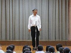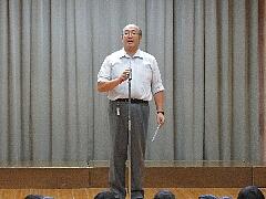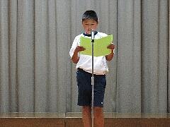 校長からプール掃除を頑張ってくれた慰労と、プールを楽しく安全に利用するための3つの「あ」について話しました。「安心しない」、「あわれない」、「あなどらない」の3つです。その後、橋本教務主任から、具体的な注意事項の説明がありました。最後に、児童代表として6年生の佐藤弘大さんが、プールの安全と自分の目標に向かって頑張るよう、呼びかけてくれました。