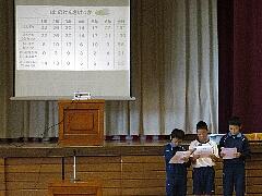 1年生は三武さんが「3びきのくま」、「うんちっち」を、2年生は大貫さんが「わたしたち うんこともだち」、「ろくべえ まってろ」を、3年生は皆川さんが「よかったな かあちゃん」、「二ひきのこぐまが たびにでた」を、4年生は仲山さんが「海賊」、「かさどろぼう」を、5年生は小松さんが「きつねにょうぼう」、「世界でいちばん貧しい大統領のスピーチ」を読んでくださいました。