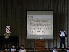 最初に小貝小児童の虫歯の状況について報告があり、むし歯がない児童にピカピカ賞が、6年間虫歯ゼロの髙木沙弥夏さんには6年間ピカピカ賞が贈られました。その後は、歯に関する〇×クイズで盛り上がりました。最後に糸井先生が虫歯の予防について分かりやすく説明がありました。会の進行を健康給食委員の皆さんが、とてもよくがんばってくれました。