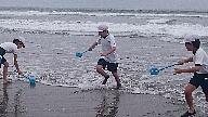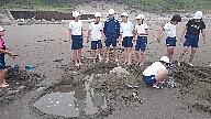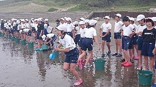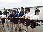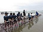 昨日は予定どおり、地引き網を引き上げました。今日は海岸に出て砂浜遊びと塩づくりを行っています。