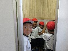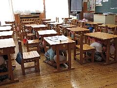 近年、日本でも比較的規模の大きな竜巻が発生するようになりました。地震や火災と同様に、竜巻への備えも必要になってきました。西田井小学校の被害の検証から、窓ガラスのない(できるだけ少ない)、できるだけ隔離された場所に児童を誘導しました。子どもたちは、真剣な態度で参加していました。