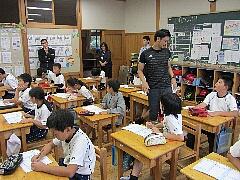今年の夢先生は、アテネオリンピック陸上1600mリレー4位の伊藤友広選手でした。最初に体育館で、ボルト選手もやっているという、ジャンプの練習やスキップの練習をしました。次に全員でボールを「落とさず、投げず、ボールを持ったまま歩かない」という約束で、体育館1周の手渡しリレーを何秒でできるかというゲームをしました。最初は1分30秒かかっていましたが、2度の作戦タイムで3回目には、30秒にタイムが縮みました。みんなで意見を出し合い、工夫をすることの大切さを学べました。