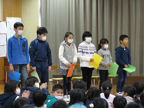 1年生は大貫さんが「わたしたち うんこ友だち」と「かぜのでんわ」、2年生は皆川さんが「ハナミズキのみち」と「金色のかも」、3年生は仲山さんが「ゆきのじょうおう」と「オオカミのともだち」、4年生は小松さんが「紙芝居 ゆきおんな」と「だめだめネコは こまったゾウ」、5年生は松尾さんが「仙人のおしえ」と「あさのたいそう1、2、3」、6年生は三武さんが「星の王子様」を読んでくださいました。